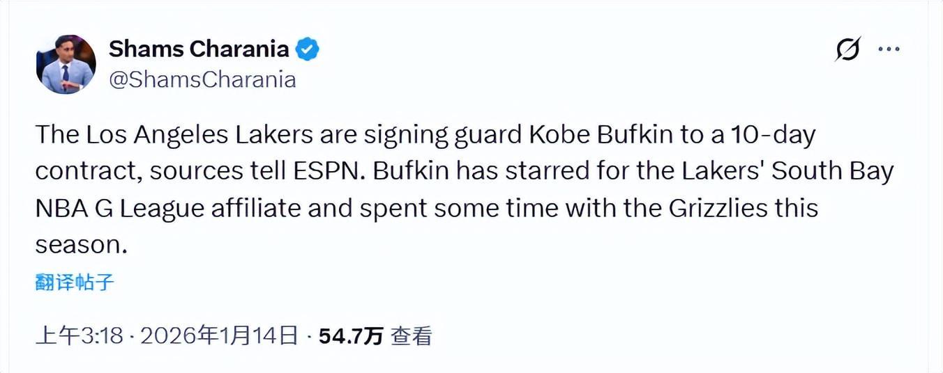 北京时间1月14日,据名记Shams报道,湖人已同意与后卫科比-巴夫金签下一份10天短合同。巴夫金是2023年NBA选秀的首轮15号秀,职业生涯前两个赛季效力于老鹰,休赛期被交易至篮网,随后在2025-26赛季常规赛开打前被篮网方面裁掉。此前有报道称,湖人在2023年选秀的首选目标就是巴夫金,但被老鹰截胡。效力老鹰的前两个NBA赛季,巴夫金饱受伤病困扰,只为...